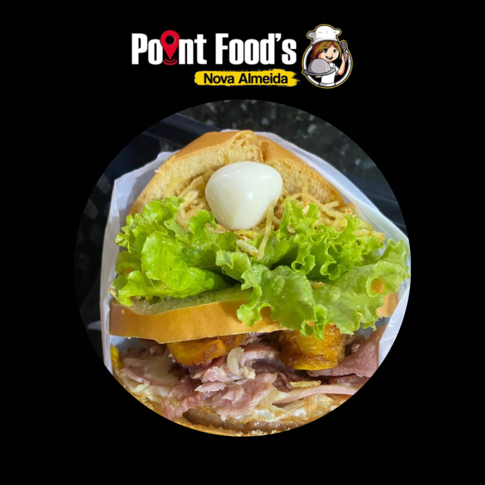 Pão com gergelim, hambúrguer frisa, banana, batata palha, milho, alface, tomate, ovo de codorna