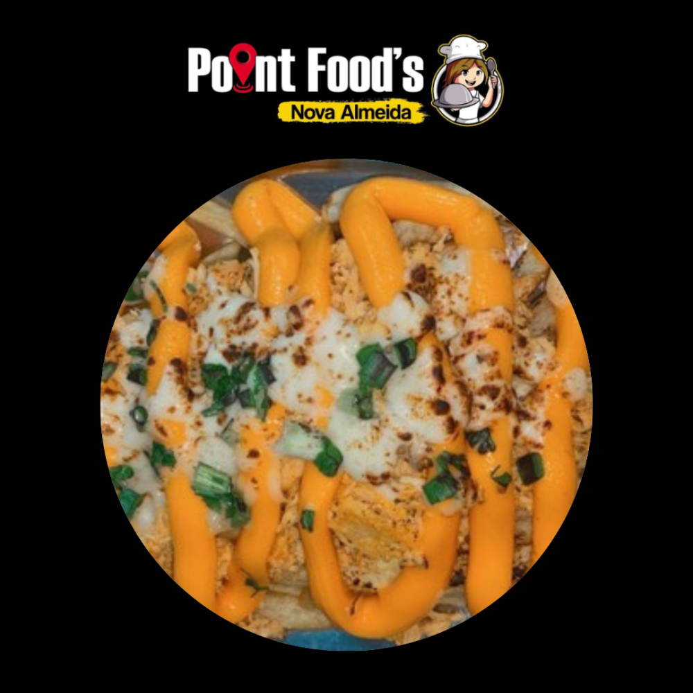 PORÇÃO 500G, Batata palito frita, frango desfiado, cheddar e mussarela